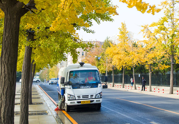 機(jī)洗(洗掃車洗掃吸一體)→機(jī)保(保潔車巡回保潔)→人沖(手持槍沖洗人行道)→人工(人工清掃保潔) -